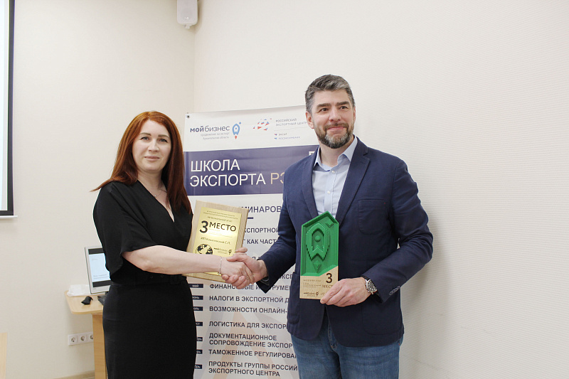 Генеральный директор агентства регионального развития Максим ЗАБОРСКИЙ вручил Анне КОВАЛЕВСКОЙ грамоты и приз за третье место в региональном этапе конкурса «Экспортёр года» по итогам 2022 года в номинации «Экспортёр года в сфере деревообрабатывающей промышленности».