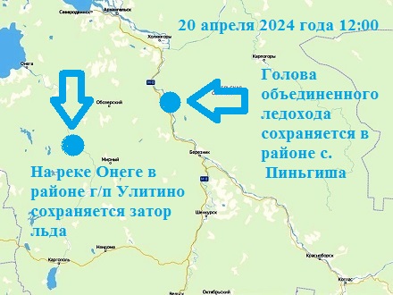 Согласно данным гидрологического бюллетеня от 20 апреля 2024 года на 12:00 по Москве, голова объединенного ледохода сохраняется в районе с. Пиньгиша (198 км от г. Архангельск), ниже по течению ледостав с разводьями и закраинами, в период с 08:00 до 12:00 мск подвижек не отмечалось.