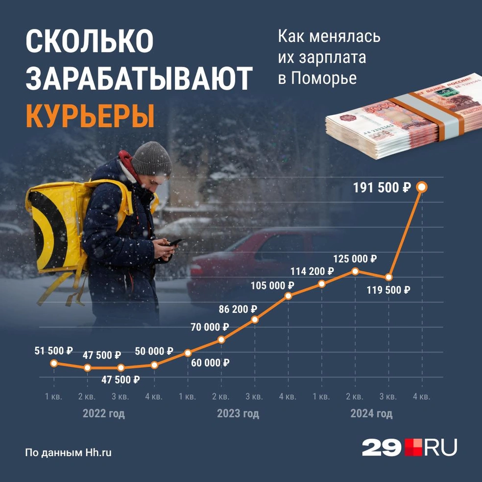 В последнее время зарплаты в вакансиях курьеров взлетели и серьезно оторвались по размеру от заработков ИТ-специалистов. Об этом 29.RU сообщили в компании hh.ru.