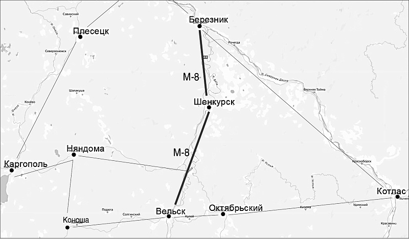 В основном, областные автомобильные дороги проходят по кругу области, не задействован центр данного круга – это г. Шенкурск. По факту так и есть: Арха нгельск – Брин Наволок – Плесецк – Каргополь – Няндома – Коноша – Вельск – Октябрский – Котлас – В. Тойма – Березник – Архангельск.