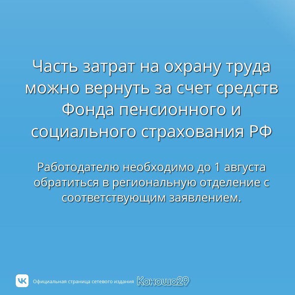 Фонд пенсионного и социального страхования Российской Федерации предоставляет возможность вернуть часть затрат на охрану труда. Для этого работодателям необходимо до 1 августа обратиться в региональную организацию с соответствующим заявлением.