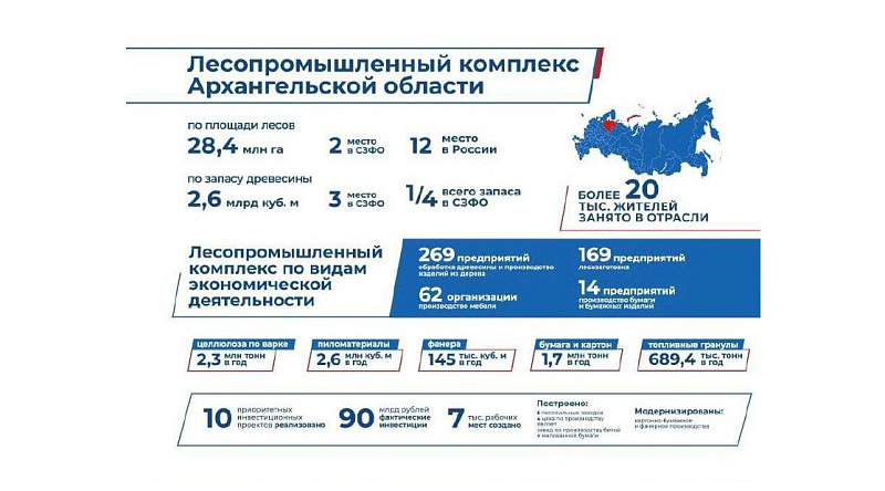 В настоящее время предприятия лесопромышленного комплекса Поморья формируют свыше 15% валового регионального продукта, а также порядка 10% налоговых доходов в консолидированный бюджет Архангельской области. В отрасли занято порядка 20 тысяч человек.