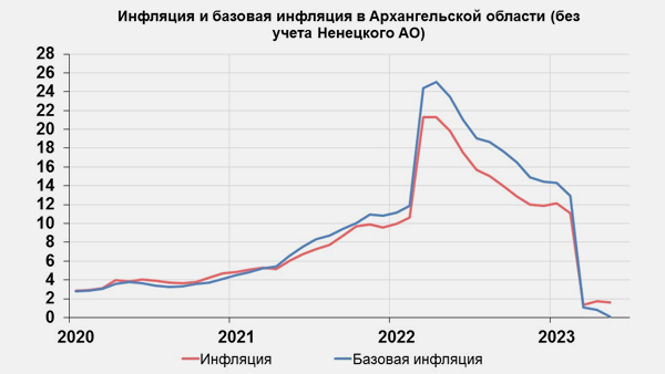 В целом годовая инфляция в Архангельской области (без учета Ненецкого АО) в мае снизилась до 1,58% после 1,73% в апреле 2023 года. При этом региональные инфляционные показатели существенно ниже, чем по Северо-Западу (2,66%), а также общероссийским меркам (2,51%).
