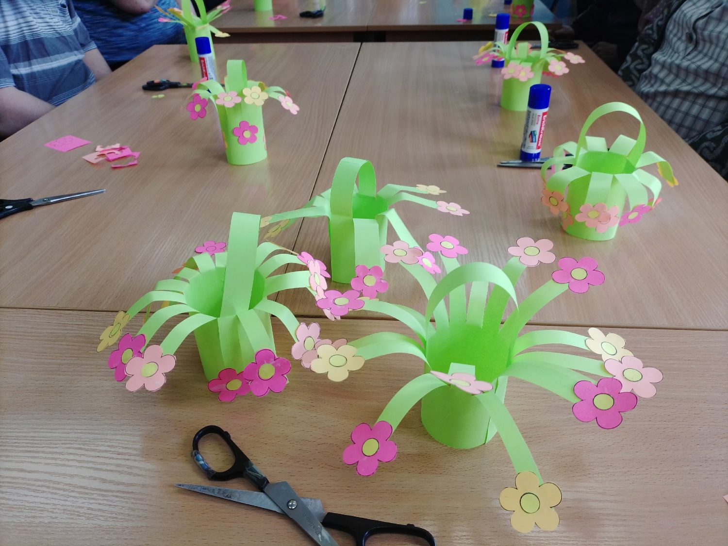 За окном наконец-то наступила долгожданная весна. Распустились почки, зацвели первые цветы. Вот и участники творческого мероприятия изготавливали яркую весеннюю корзинку с цветами. Поделку создавали при помощи цветной бумаги, клея и ножниц. К концу занятия у каждого получилась красивая корзинка с цветами.