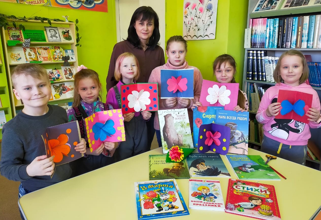 Юные читатели вспомнили и рассказали стихи, которые они готовили в школе: В. Берестова «Праздник мам», З. Петровой «Спасибо!», Н. Саконской «Разговор о маме». В преддверии праздника ребята сделали для своих мам открытку в технике объемной аппликации и ответили на вопросы литературной викторины «Мамы из сказок».