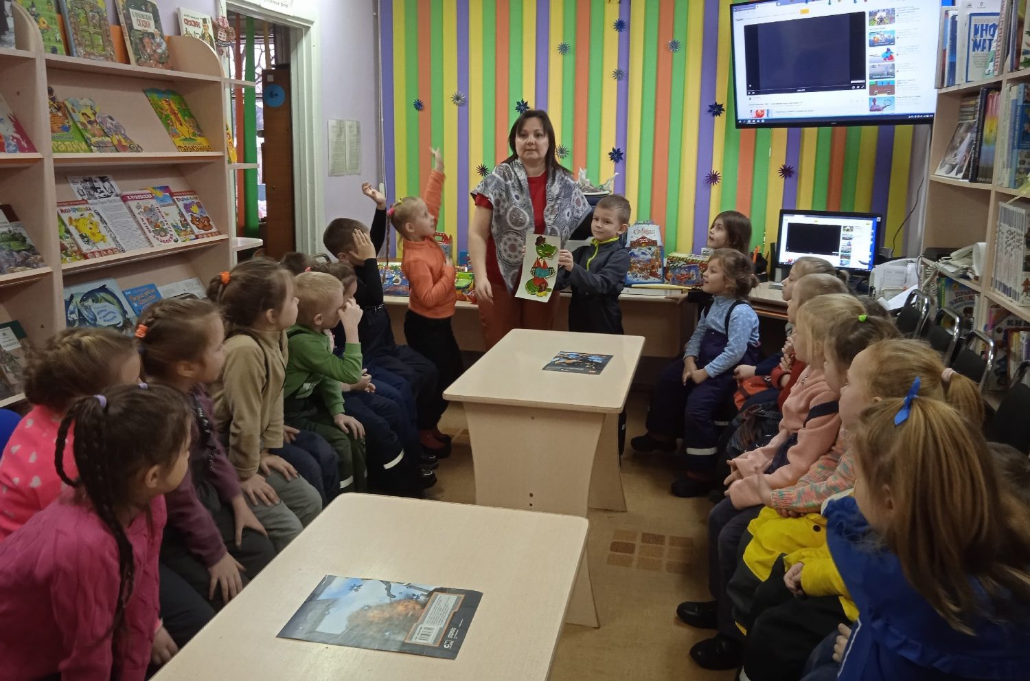 Началось мероприятие с «Блиц-разминки», где дети, отвечали на вопросы. А дальше были конкурсы «Волшебная цепочка», «Составь картинку», «Угадай героев сказки», «Вам передали привет» и другие. Участники также выполняли задания мультвикторины, угадывали отрывки песен из мультфильмов. Особенным интересом у посетителей пользовалась книжная выставка «С книжной детской страницы – на большой экран!». Заявленная тема встречи была воспринята «на ура» и вызвала массу положительных эмоций. В конце мероприятия девчонки и мальчишки посмотрели мультфильм «Песенка мышонка». Дети ушли не с пустыми руками: каждый получил сладкий презент.