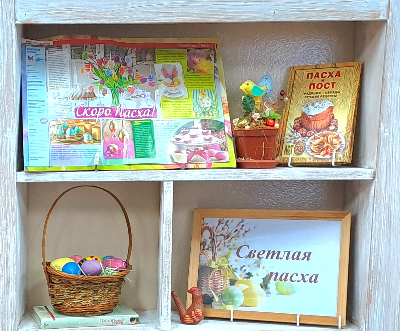 На взрослом абонементе Соломбальской библиотеки № 5 им. Б. В. Шергина оформлена книжная выставка-экспозиция к православному празднику Пасхе.