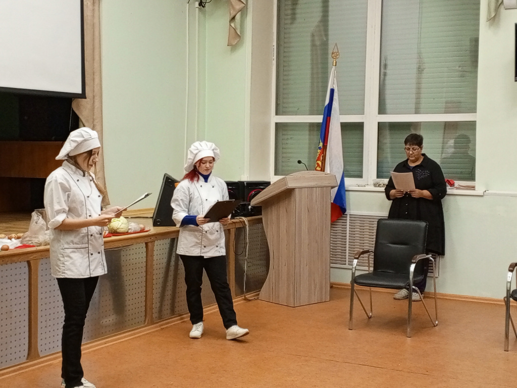 В завершении недели по специальности «Кулинары XXI», 27.10.2023 в актовом зале состоялся конкурс «Веселые старты юных кулинаров» Соревновались две команды «Поварята» (1 ПД А- Бочкарева Надежда, Беляева Елена, Шаховал Софья,