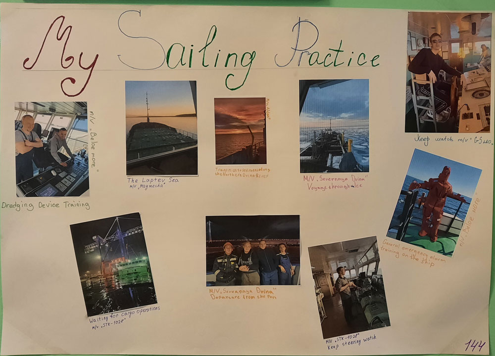 «На плакатах мы показали, как провели свою вторую морскую практику. Кто-то показал суда, на которых они побывали, написали их характеристики. Многие курсанты показали, чем они занимались как кадеты или матросы. И это не только работа на палубе, но и несение вахты на мостике. Большая часть курсантов работала на судах российских компаний "Северный Проект", "Архангельский траловый флот", «Северное морское пароходство" и других. Но есть и те, кто ходил под флагами других стран от компаний "Wilson","Briese Shipping" других. Благодаря чему ребята посетили зарубежные страны - Турцию, Польшу, Нидерланды, Швецию, Великобританию. И это даже не половина списка. Своими плакатами мы хотели поделиться эмоциями и нашим небольшим опытом с младшими курсами, может быть, даже придать им мотивации в изучении английского языка».