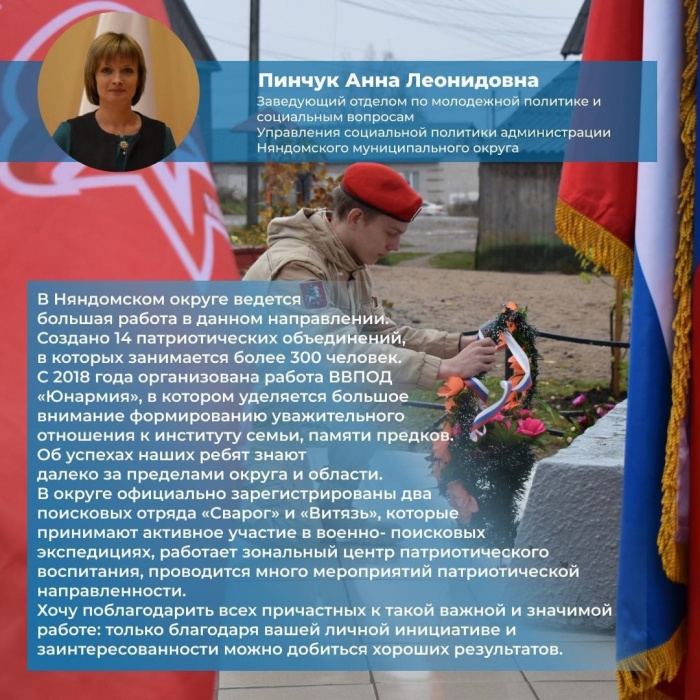 В Няндомском округе патриотическое воспитание является одним из приоритетных направлений молодежной политики: «Без него невозможно формирование личности, обладающей качествами гражданина, патриота своей Родины», - отметила Анна Леонидовна Пинчук, курирующая это направление.