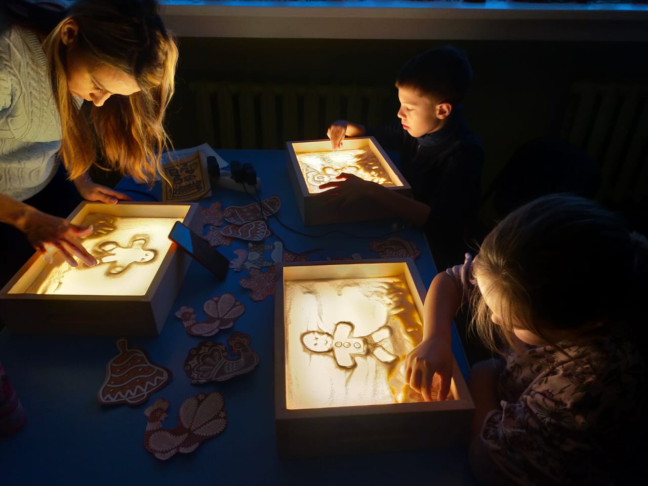 В Варавинской детской библиотеке № 11 в рамках проекта АРТ-каникулы «Пряничные истории на песке» состоялись занятия по рисованию песком на световых планшетах.