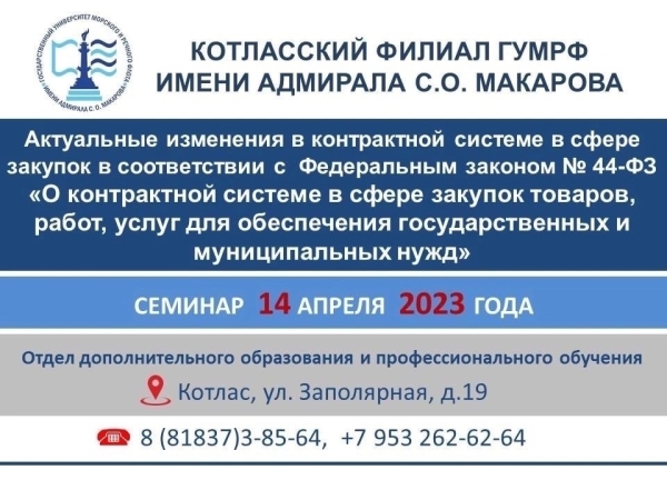 В Котласском филиале ГУМРФ имени адмирала С.О. Макарова состоится семинар для специалистов — работников контрактных служб, контрактных управляющих, руководителей контрактных служб, членов комиссий по закупкам.