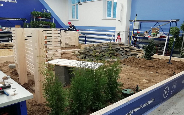 В распоряжении молодых ландшафтных дизайнеров – мастерские на четыре рабочих места, где есть всё необходимое, в том числе живые деревья, кустарники и цветы, различный садовый инвентарь, разные виды тротуарной плитки для устройства дорожек, камнерезный станок, оборудование для системы полива и многое другое.
