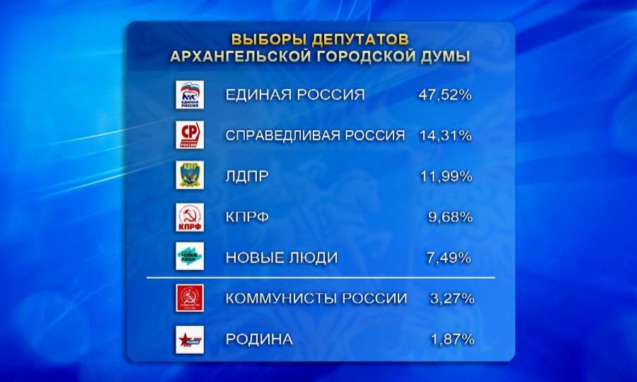 Партии "Единая Россия" отдали предпочтения 47 целых 52 сотых процента жителей столицы Поморья, далее идут представители партии "Справедливая Россия - Патриоты - За правду", результат 14,31, партия "ЛДПР" набирает почти 12 процентов, КПРФ - 9,68 и замыкают пятёрку лидеров "Новые люди" с результатом 7,49 сотых процента избирателей. Две остальные партии не преодолели пятипроцентный порог.