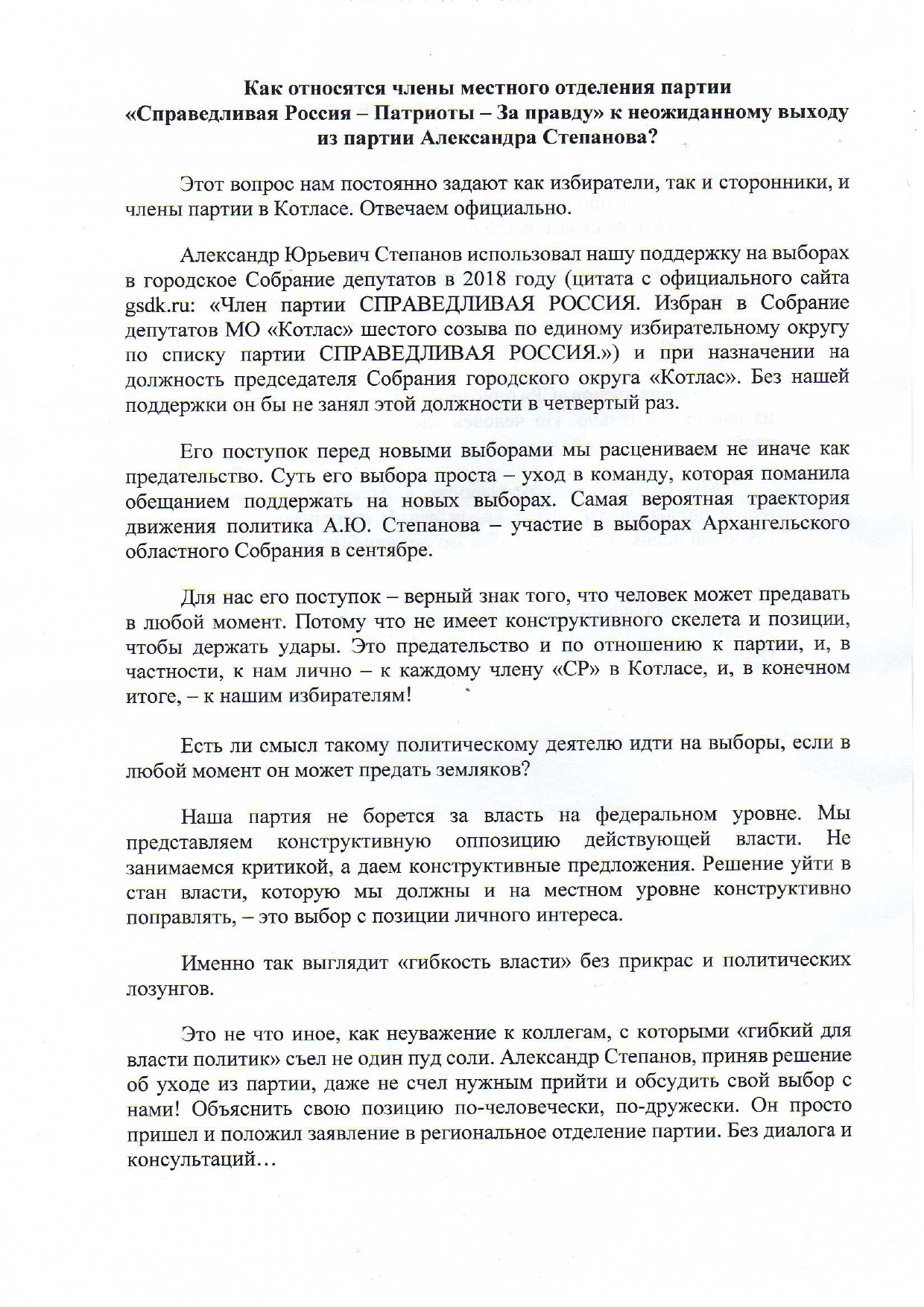 Александр Юрьевич Степанов использовал нашу поддержку на выборах в городское Собрание депутатов в 2018 году (цитата с официального сайта gsdk.ru: "член партии СПРАВЕДЛИВАЯ РОССИЯ. Избран в Собрание депутатов МО "Котлас" шестого созыва по единому избирательному округу по списку партии СПРАВЕДЛИВАЯ РОССИЯ") и при назначении на должность председателя Собрания городского округа "Котлас". Без нашей поддержки он бы не занял этой должности в четвертый раз.