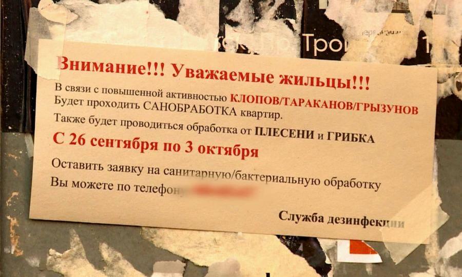 «Догма групп» — компания из Екатеринбурга. Реклама этой фирмы может ввести жильцов в заблуждение. Якобы санитарная обработка — обязательна и сделать её нужно в конкретные сроки, указанные в объявлении. Также из объявления можно понять, что услугу оказывает государственная служба, а не частная компания. Это не так. Кстати, обеспокоенные люди писали в соцсетях, что вместе с объявлениями в некоторых квартирах действительно появились клопы. И сделали вывод, что им их подкинули.