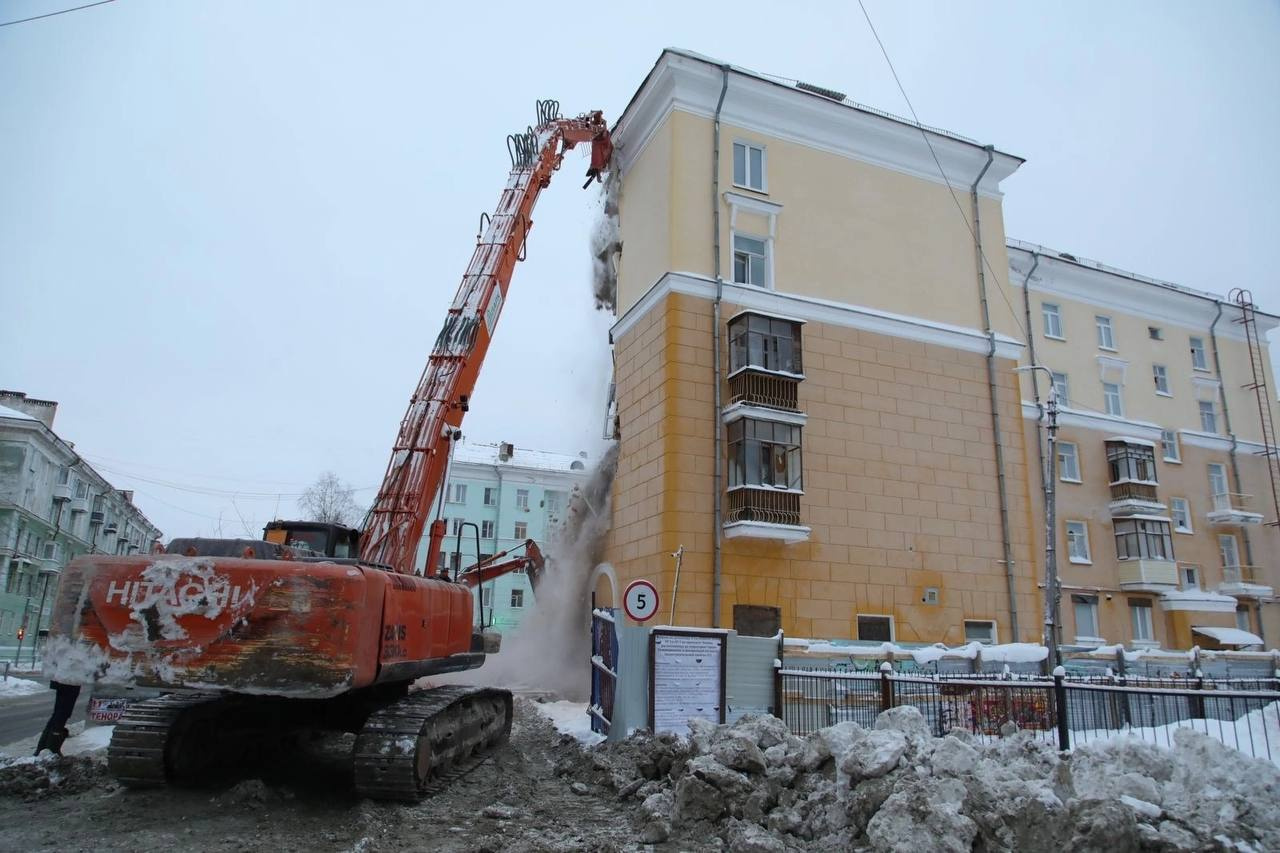 В Северодвинске сносят дом на Ленина, 5, часть которого обрушилась в 2012 году . Глава города Игорь Арсентьев назвал работы историческим событием.