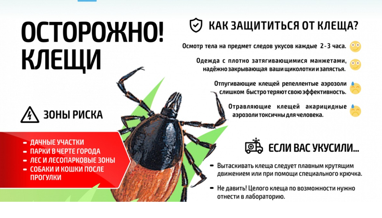 - Избегайте места обитания клещей, особенно в мае-июле.
