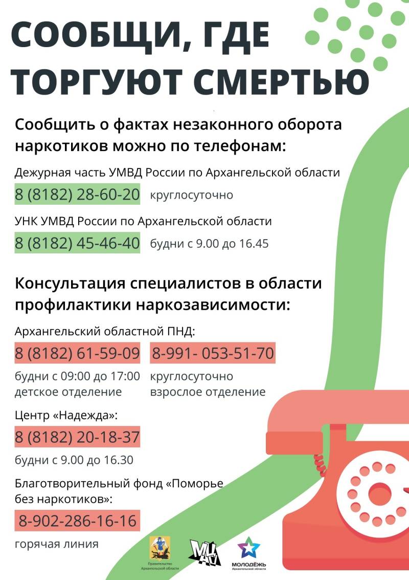 Информацию о местах продажи наркотиков, фактах склонения к употреблению либо распространению наркотических средств вы можете сообщить: - в дежурную часть УМВД России по Архангельской области: 8 (8182) 28-60-20 или 02 (круглосуточно); - УНК УМВД России по Архангельской области: 8 (8182) 45-46-40Наркозависимым можно помочь, в том числе анонимно. За помощью в Архангельске можно обратиться: