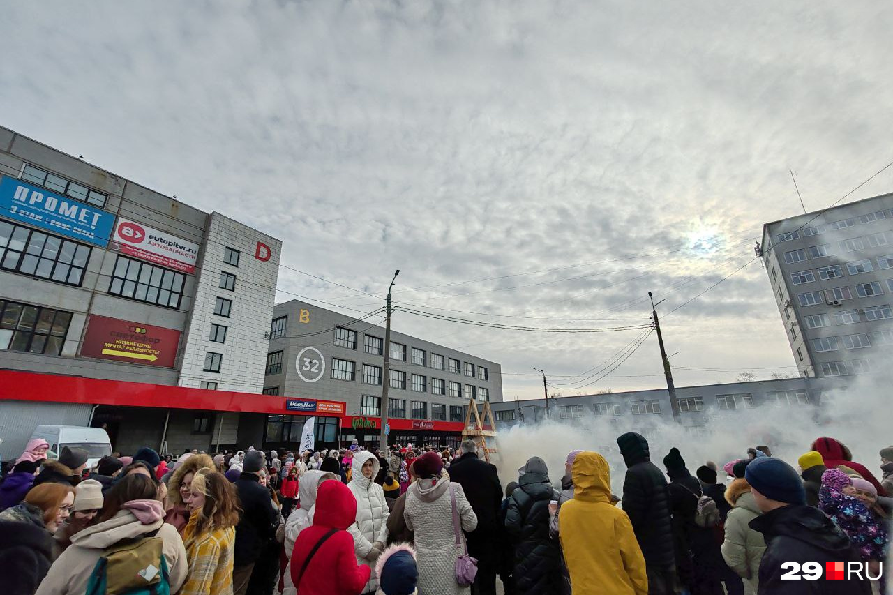Не только в «Малых Корелах» , но и в центре Архангельска сегодня отмечают Масленицу. Общегородского праздника на набережной в этом году не проводят. Вместо этого свои мероприятия организовали разные культурные центры, а также блинами угощают на избирательных участках во время выборов . Мы побывали на одной из площадок, где сегодня провожали зиму, — возле «Объекта 32», где раньше была «Правда Севера». Смотрите, сколько людей там собралось.