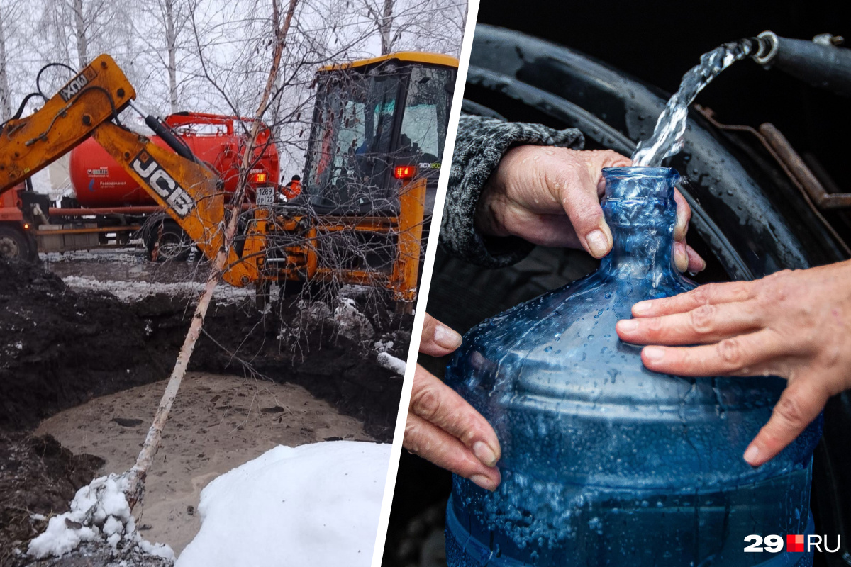 Для жителей отключенных домов организуют подвоз воды Специалисты не могут добраться до труб из-за кабеля связи Фото: «РВК — Архангельск» / Александр Ощепков На коммунальных сетях Архангельска снова авария.