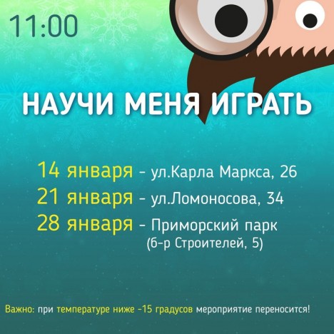 21 января в 11:00 волонтёры проекта «Научи меня играть» приглашают мальчишек и девчонок, а также их родителей на игровую программу, которая состоится на улице Ломоносова, 34.