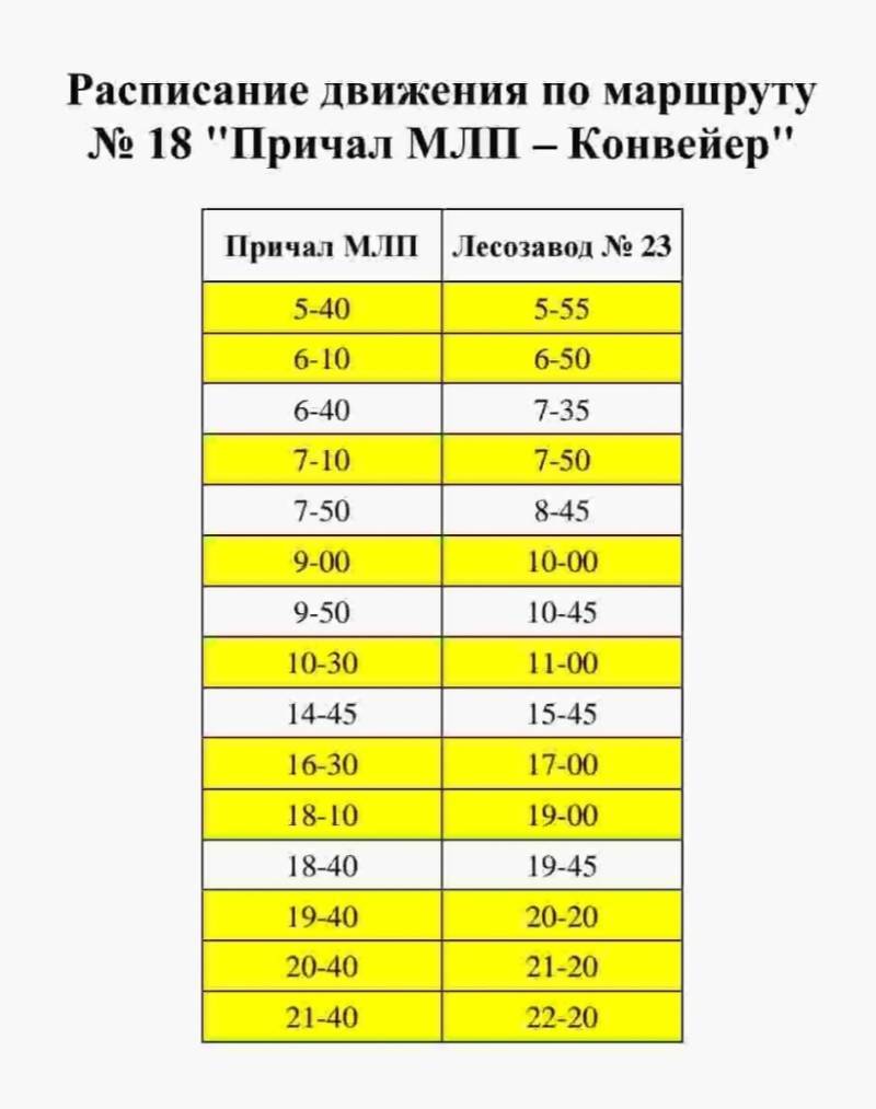 С учетом пожеланий жителей скорректировано расписание островного маршрута № 18. Желтым цветом выделены дополнительные рейсы. Из-за сложнейшей ледовой обстановки причал на 14 лесозаводе больше не сможет принимать буксиры, и на острове продолжит выполнять дополнительные рейсы автобус.