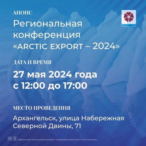 27 мая с 12:00 до 17:00 в конференц-зале Агентства регионального развития Архангельской области (Архангельск, набережная Северной Двины, 71) состоится региональная конференция «Arctic Export 2024».
