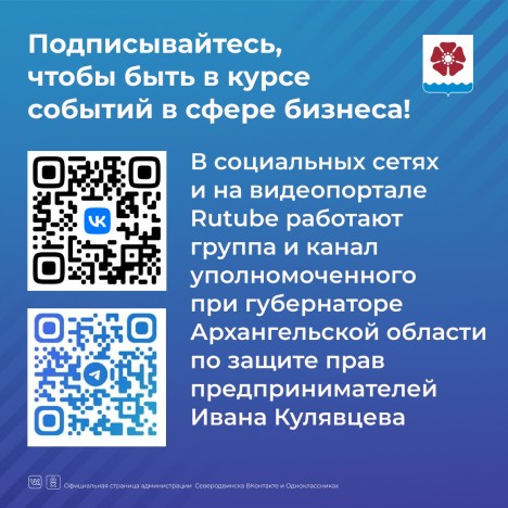 В социальных сетях VK и Telegram, на видеопортале Rutube работают группа и канал уполномоченного при губернаторе Архангельской области по защите прав предпринимателей Ивана Кулявцева.