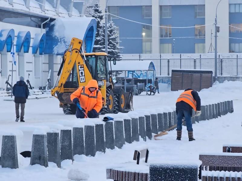 В субботу и в воскресенье бригады по очереди были заняты на очистке от снега и наледи пешеходных дорожек, тротуаров, мест отдыха и массового пребывания людей, участков возле памятников.