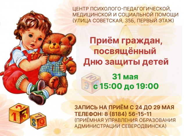 31 мая с 16:00 до 19:00 в помещении Центра психолого-педагогической, медицинской и социальной помощи (улица Советская, 35Б, первый этаж) состоится приём граждан по вопросам охраны и защиты прав детей.