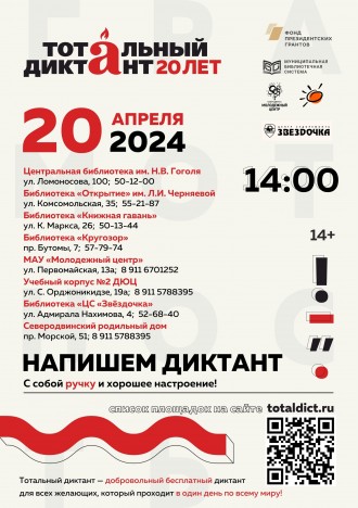 20 апреля в 14:00 на 8 площадках города корабелов можно будет написать «Тотальный диктант - 2024».