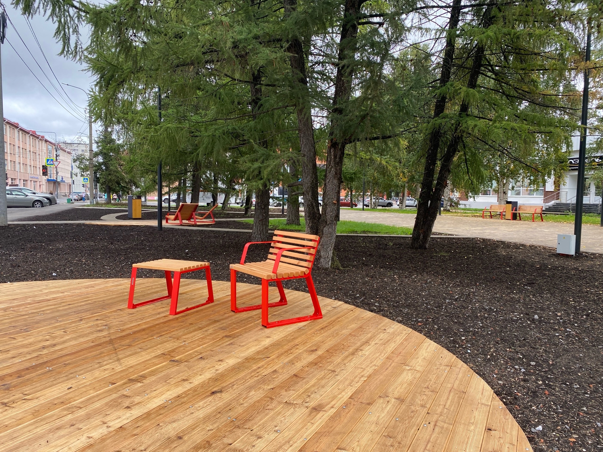 Уличная мебель в сквере выполнена из дерева с красными металлическими вставками, которые придают яркость элементам, но не совсем вписываются в окружающую среду. Есть несколько кресел-шезлонгов, рядом с которыми установлены столики. Любопытно, что где-то выставлено по два кресла, а где-то по одному – рай интроверта.