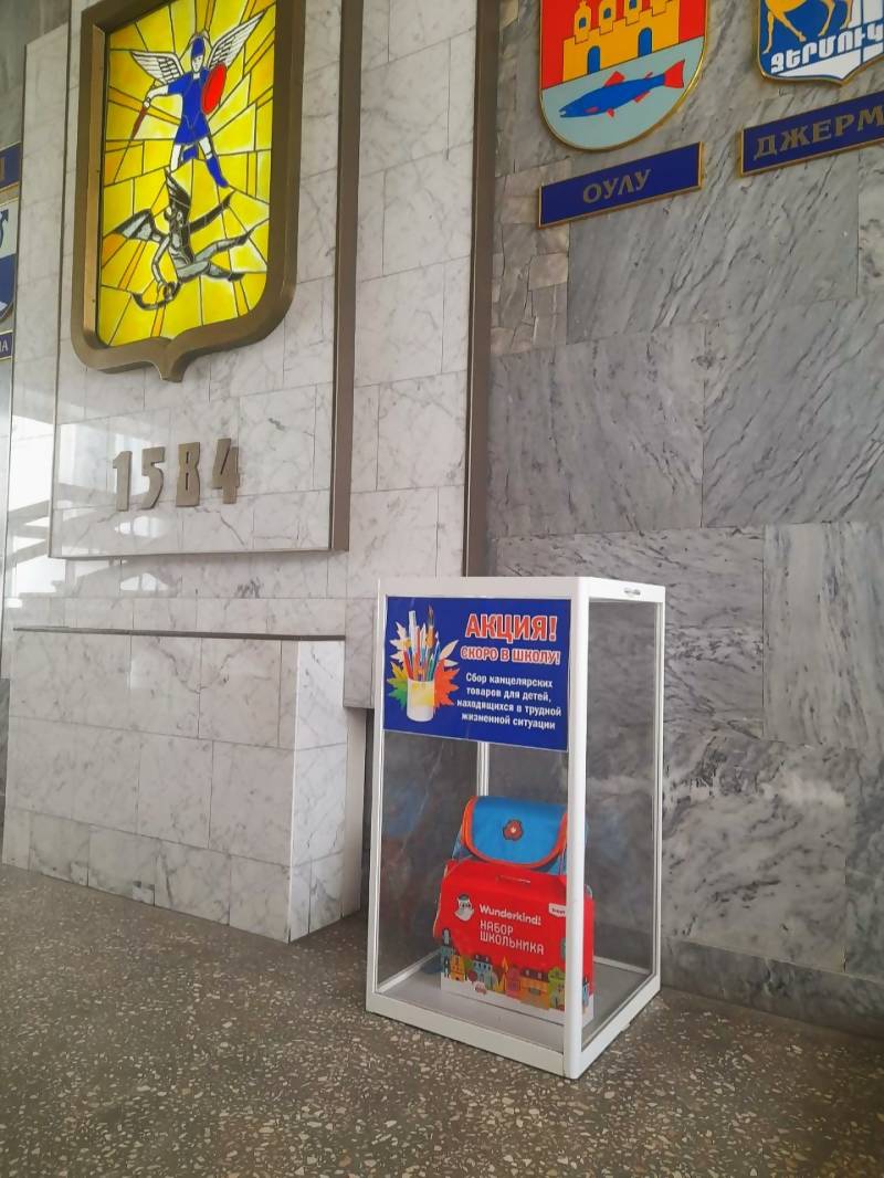 В здании администрации города на площади Ленина, 5 (на площадке центральной лестницы) установлен специальный куб для сбора канцелярских принадлежнойстей, книг, рюкзаков и всего прочего, что необходимо школьникам.