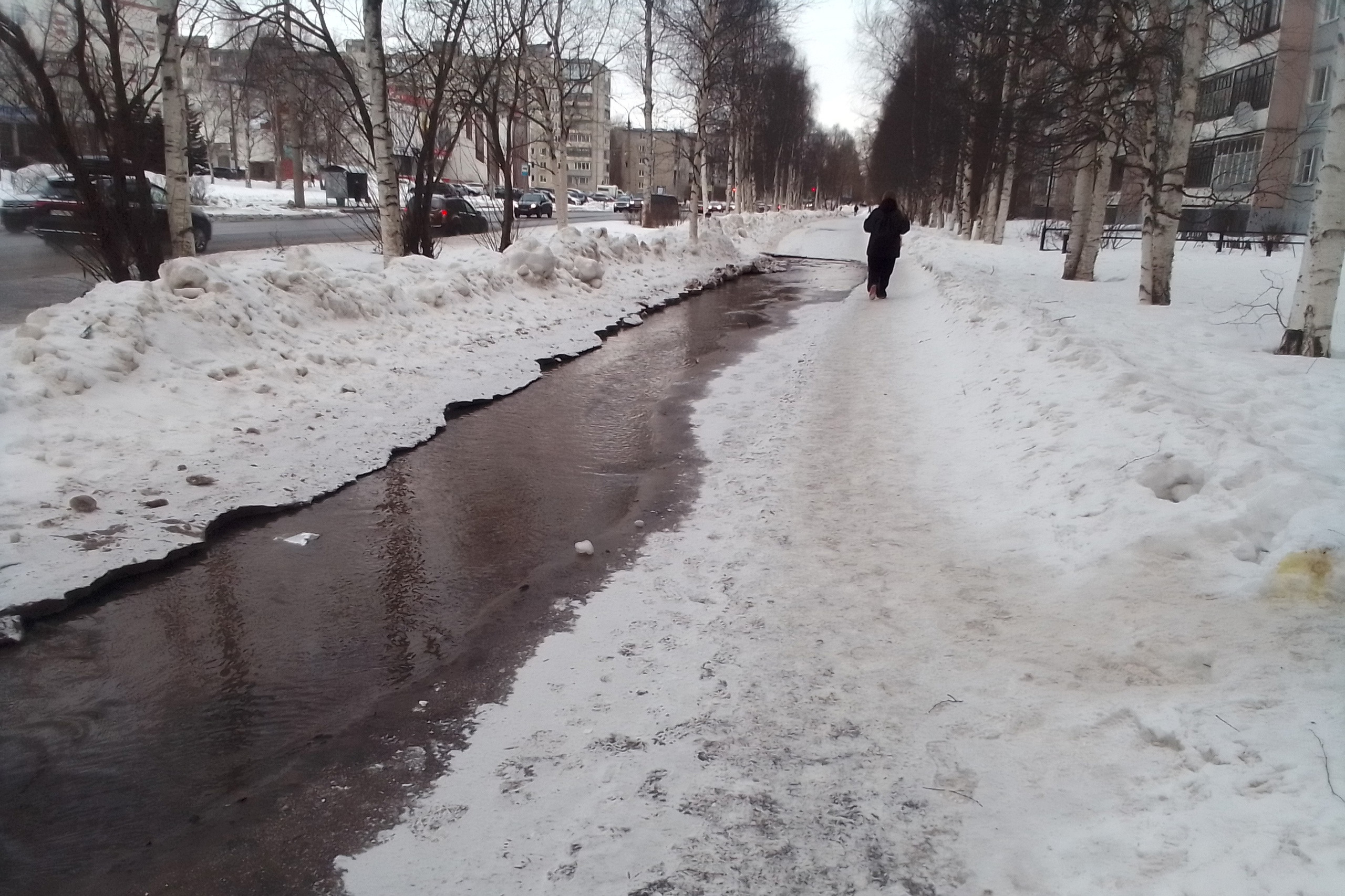 А в феврале огромная лужа образовалась в центре Архангельска. Горожане переходили ее вброд, по щиколотку в воде .