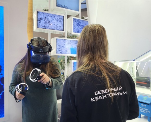 Вчера обучающиеся VR/AR-квантума Георгий Иванов и Никита Машарин вместе с наставниками Алёной Ивановой, Артёмом Глотовым и Екатериной Кошелевой помогали посетителям выставки примерить роли сотрудников нефтедобывающей платформы, кораблестроителей и конкурсантов Чемпионата России по лесотехническому мастерству.