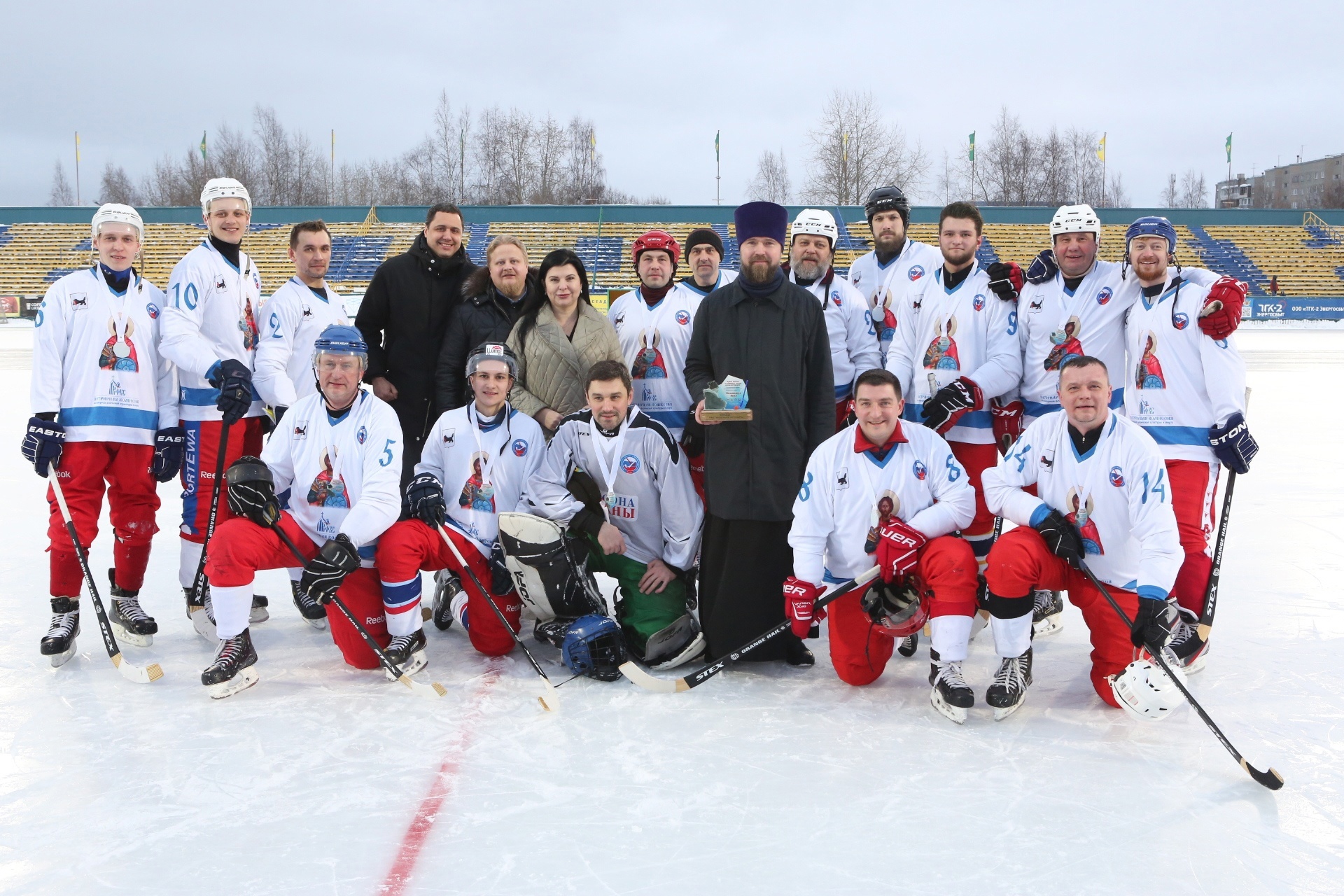 Товарищеский матч между сборной Патриархии и сборной администрации губернатора и правительства Архангельской области по хоккею с мячом прошел 21 января на стадионе «Труд» в Архангельске.