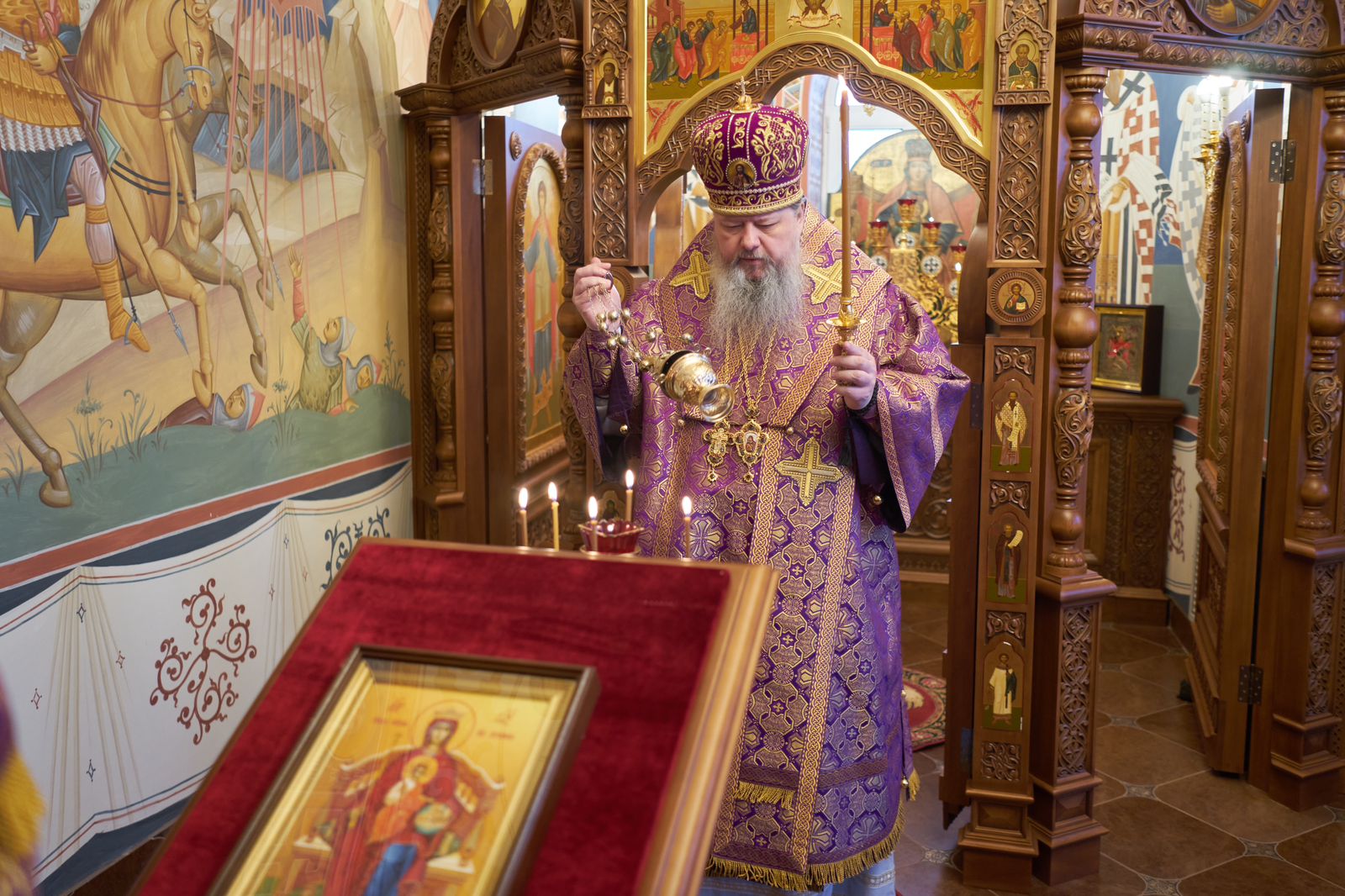 Митрополит Архангельский и Холмогорский Корнилий 14 марта, в канун праздника иконы Божией Матери, именуемой «Державная», молился за великим повечерием и совершил полиелейную утреню в храме Феодоровской иконы Божией Матери на архиерейском подворье.