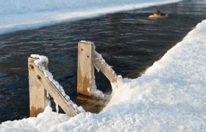 в зимнее время купели оборудуются на ледовой поверхности водных объектов не ближе 100 м к ледовым переправам. Для обеспечения безопасного нахождения людей толщина льда должна быть не менее 30 см, размер проруби (иордани) с открытой водой не более (150 х 150) см, глубина в месте размещения купели не должна превышать 150 см.