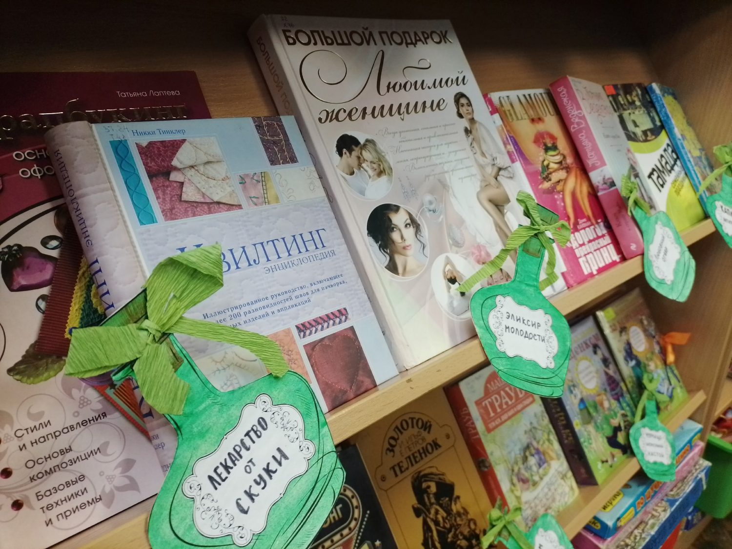 На выставке «Аптека для души» представлены самые разнообразные книги на любой вкус. Кто интересуется фантастикой, может обратиться к рубрике «Настойка адреналиновая». «Лекарство от скуки» — эта рубрика будет интересна людям творческим, которые не могут сидеть без дела, занимаются вязанием, бисероплетением, шитьем, вышиванием. Тем, кто любит любовные романы и детективы, приглянется рубрика «Любовный отвар». Кто грустит — «Капли антигрустиновые».