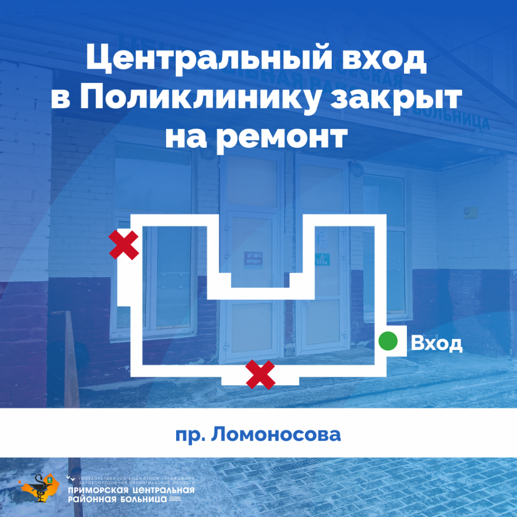 Уважаемые пациенты! Сообщаем вам, что с 7 ноября Центральный вход в поликлинику закрыт на ремонт, до окончания ремонтных работ просим пользоваться входом со стороны ул.