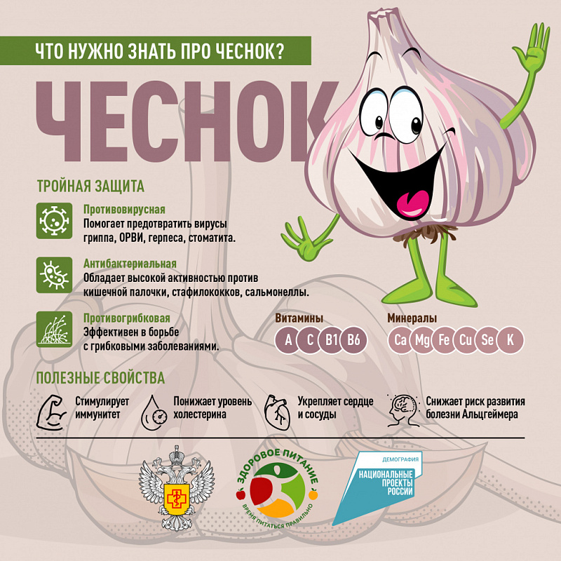- Укрепляет иммунную систему. При простуде, насморке, болях в горле, инфекционных заболеваниях верхних дыхательных путей, в том числе и гриппе, чеснок будет вашим надежным помощником в борьбе с болезнью. Также активные вещества чеснока разжижают мокроту и способствуют ее быстрому выведению.