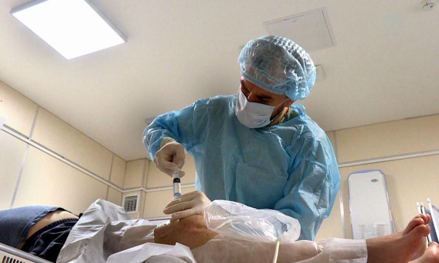 На операционном столе Александр. Итогом неудачной поездки на снегоходе стала для него тестовая блокада коленного сустава.