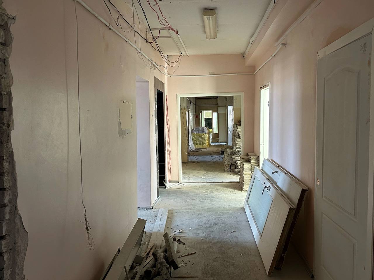 Сейчас строители осуществляют демонтаж перегородок, подвесных потолков, готовят стены к выравниванию и штукатурным работам.