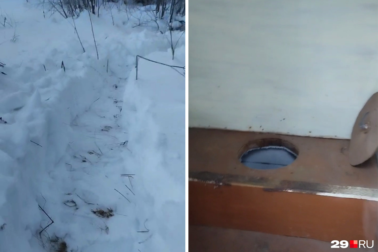 Так как пункт передвижной, в нем не предусмотрен септик В туалет пришлось рыть тропинку Фото: Читатель 29.RU Депутаты Холмогорского округа раскритиковали условия в новом медпункте на трассе М-8.