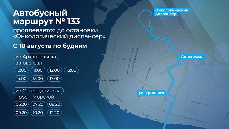 С 10 августа по будням часть автобусов, выполняющих рейсы по маршруту №133 из Северодвинска в Архангельск, будет останавливаться у областного онкологического диспансера.