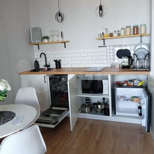 - Полный набор посуды, средство для мытья посуды, фильтр для воды, столовые приборы, штопор, дуршлаг;